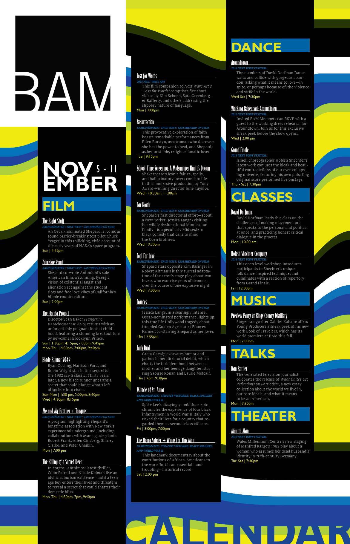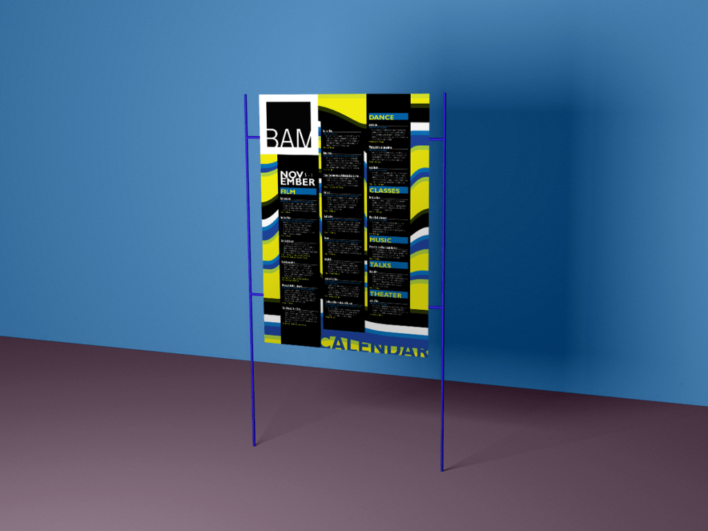 As part of an assignment for a Digital Graphics class I took at FIT, we were to design a poster for the Brooklyn Academy of Music (BAM), listing their November events. Textual data was provided and we were to develop a clear hierarchy with the same.