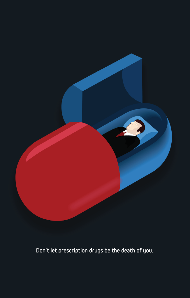 A poster designed to communicate the dangers of prescription drug abuse and addiction through the use of a visual pun.