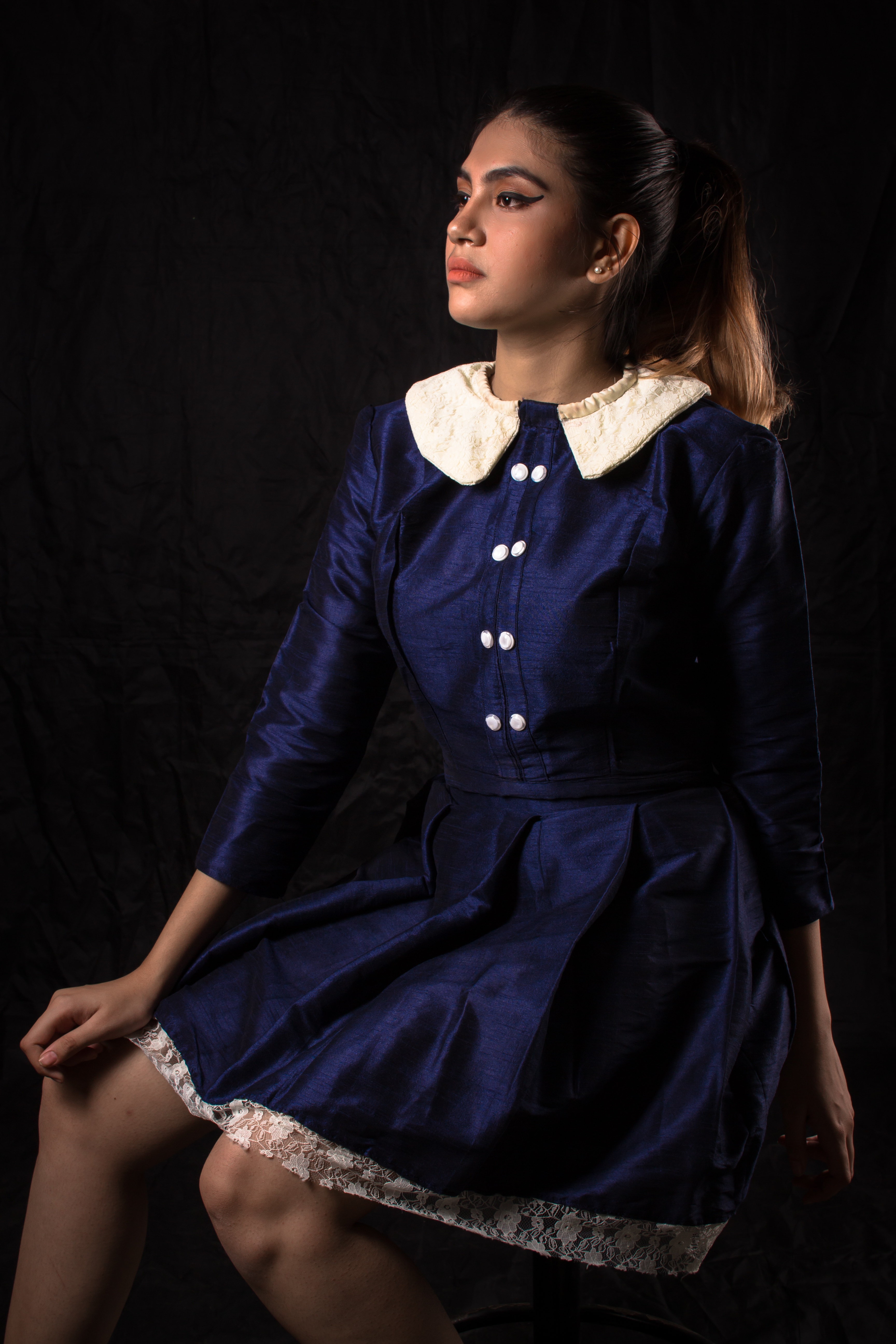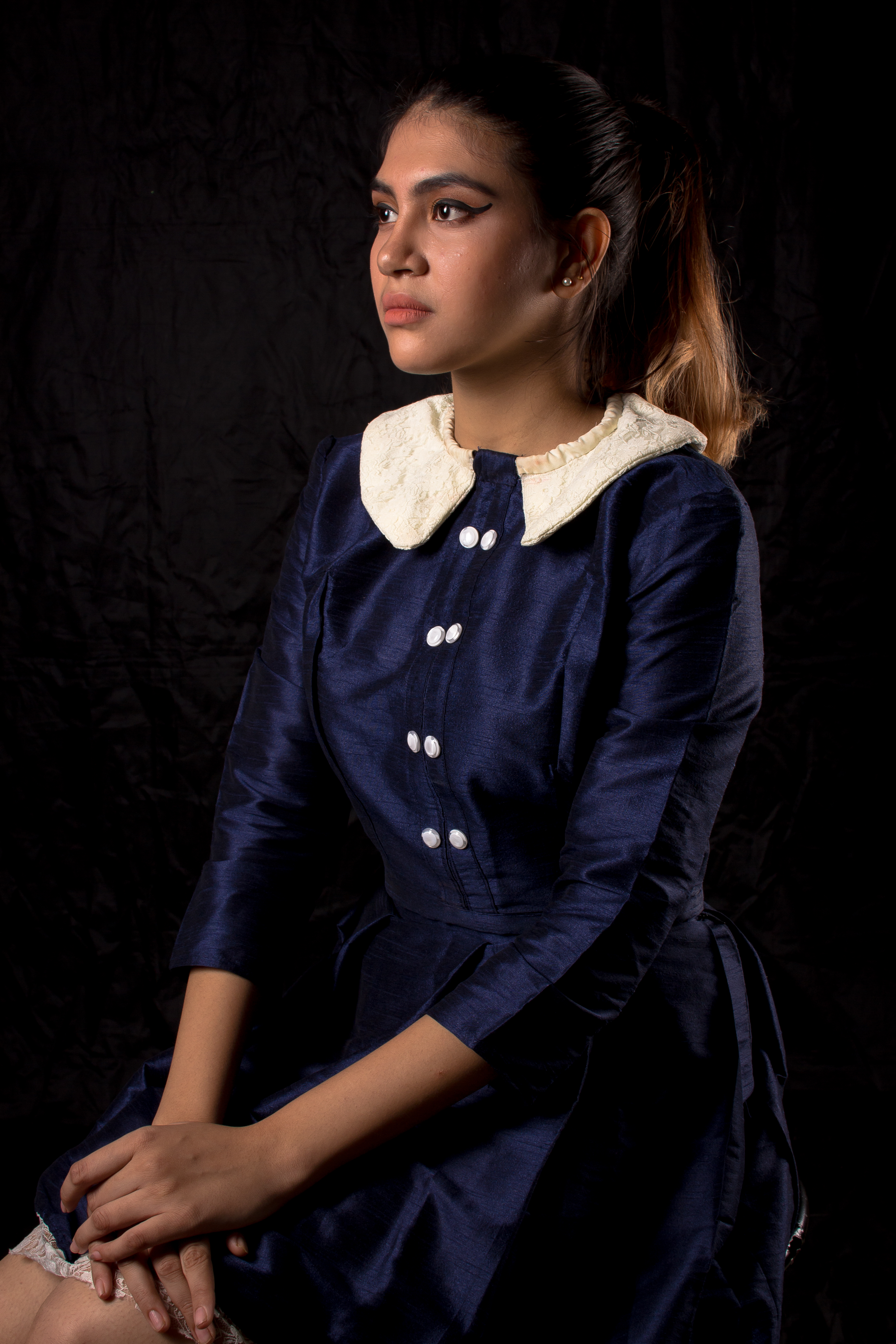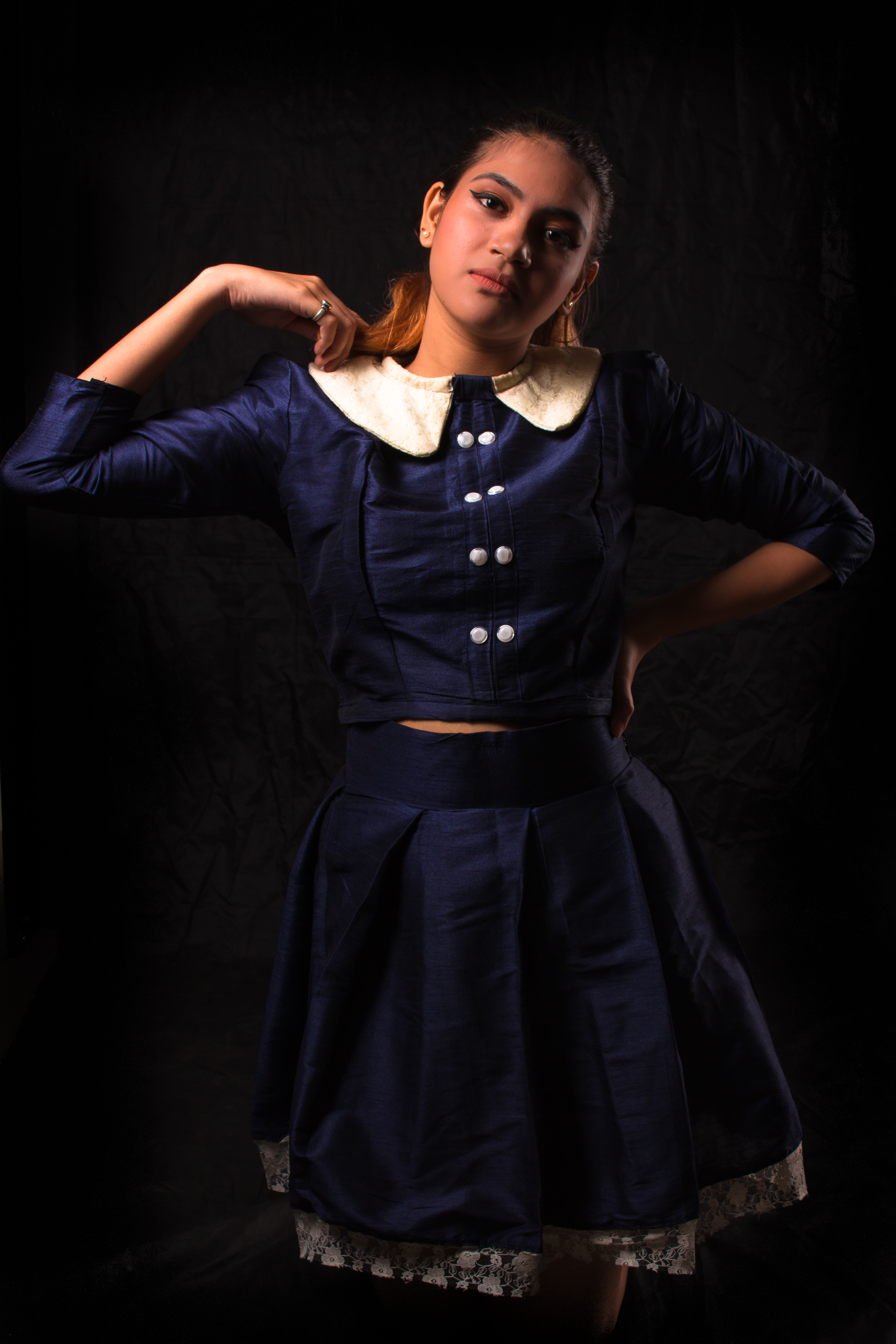 As part of an end-term assignment for a Garment Construction class I took at NIFT. This garment set includes a blouse with a matching a skirt, complete with a peter pan collar and lace detailing.
