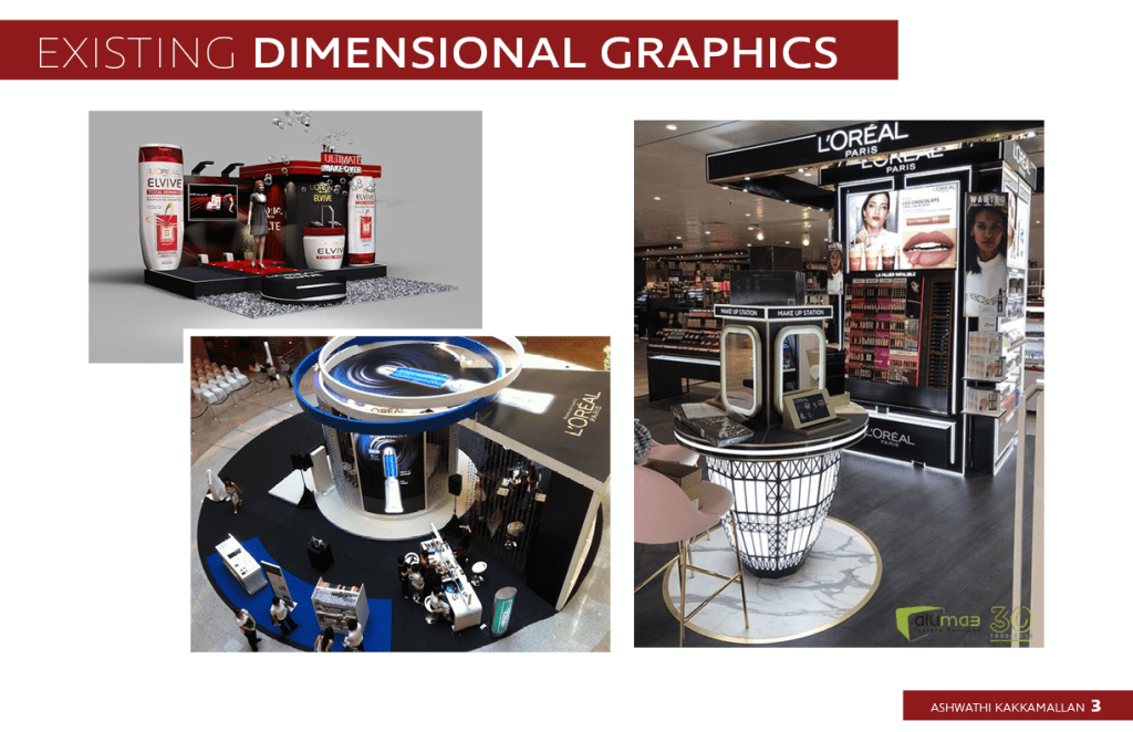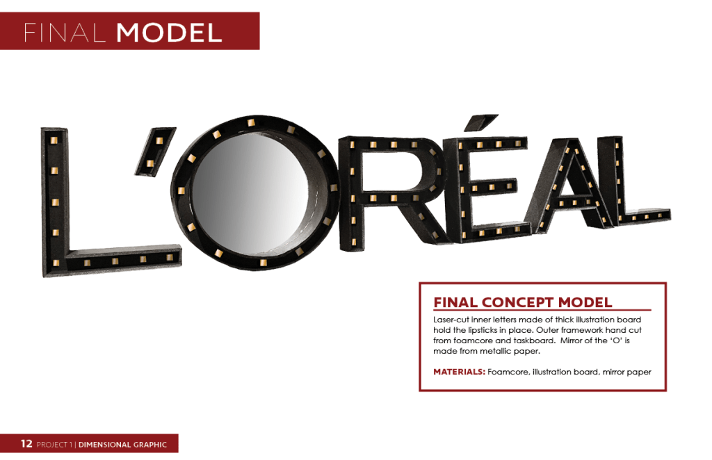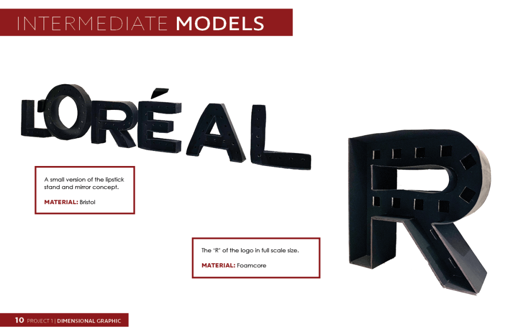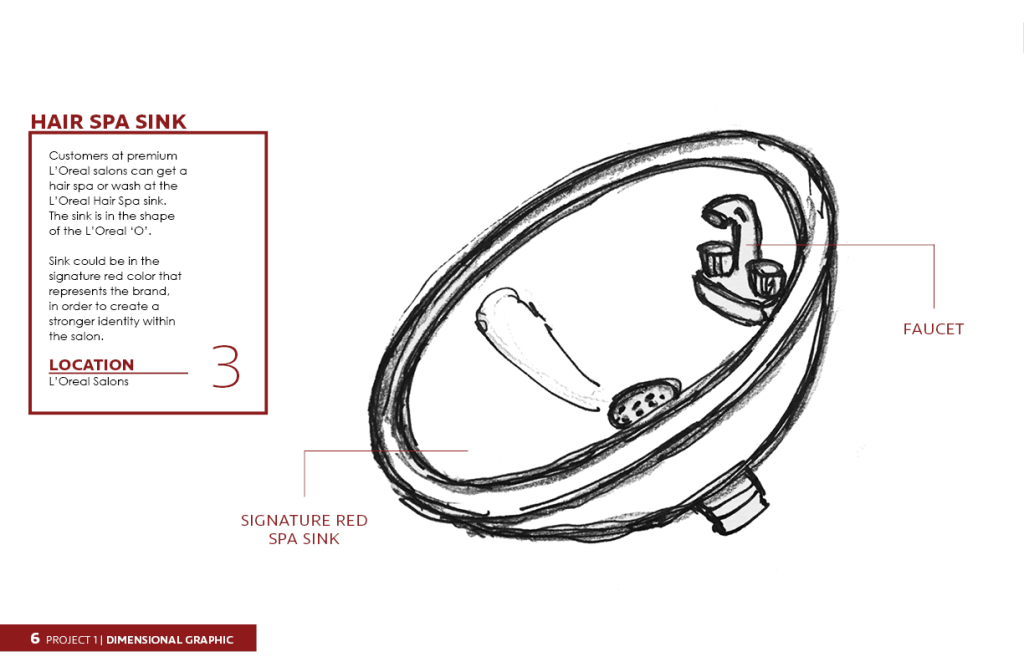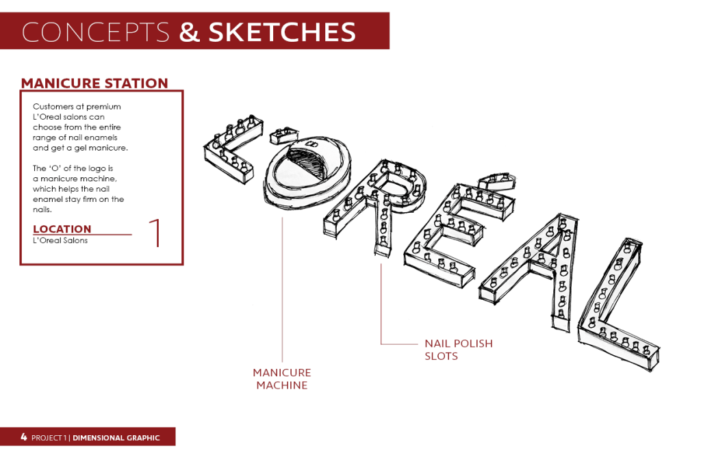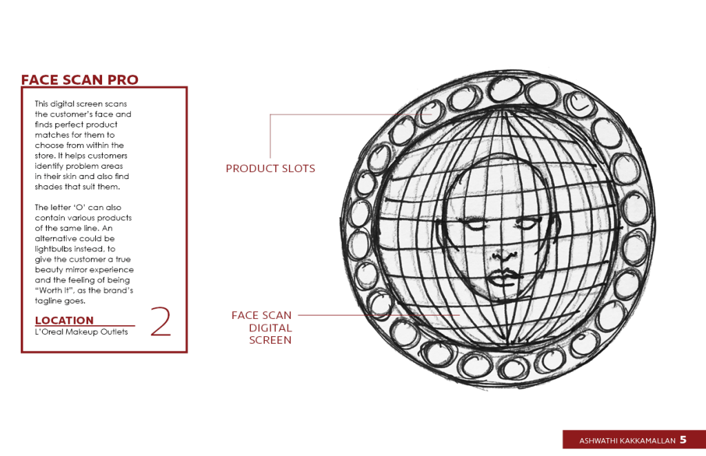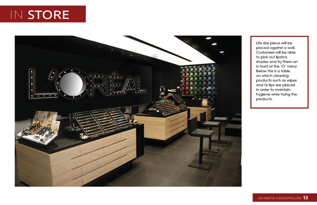 I chose the brand L’Oréal and created a lipstick wall where customers could try on new lip colors and interact with the brand. The alphabets of the logo served as the base form, and the lipsticks would be inserted into these letters through square-shaped holes. The ‘O’ in the brand’s name would be a vanity mirror.
