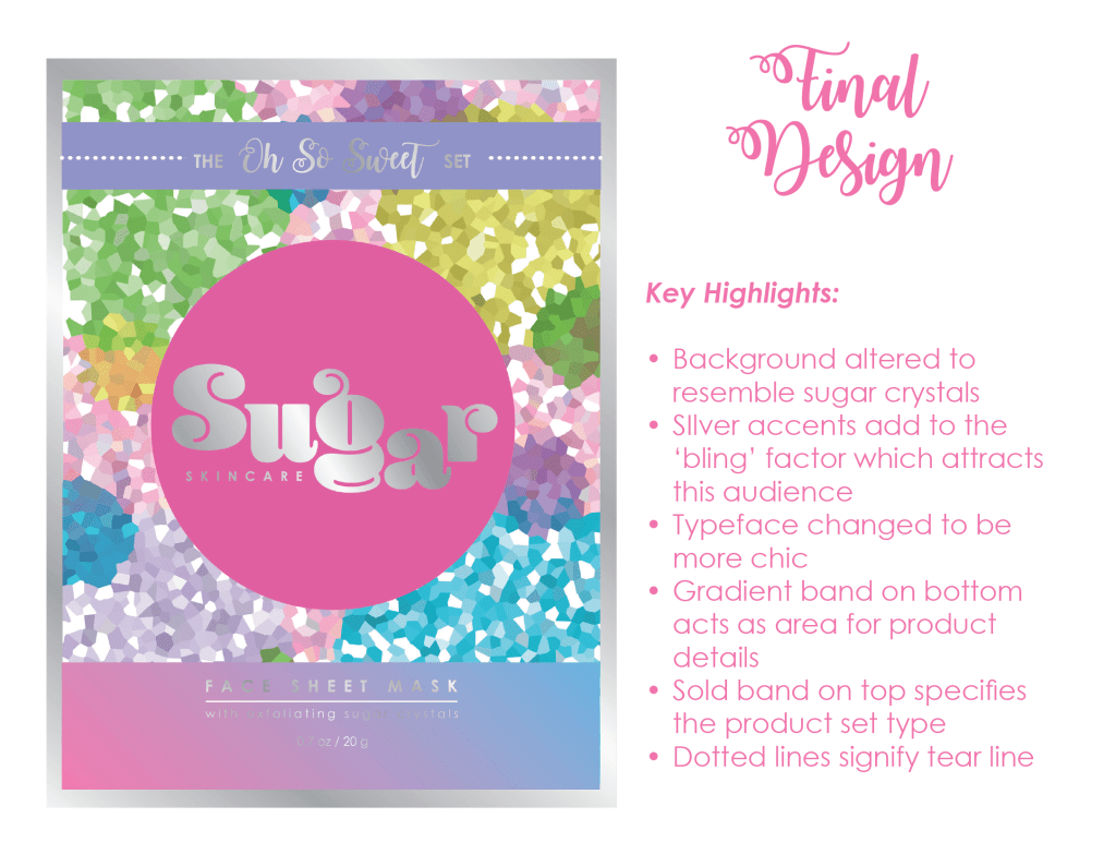 SUGAR SKINCARE is a brand that caters to young girls who have just started to develop an interest in beauty products. The brand aims to grab attention from a younger target market in a product category that is generally sought out by older women.