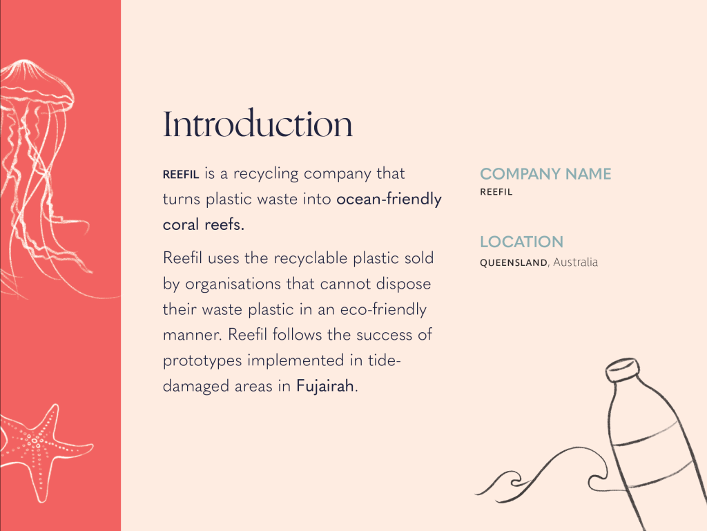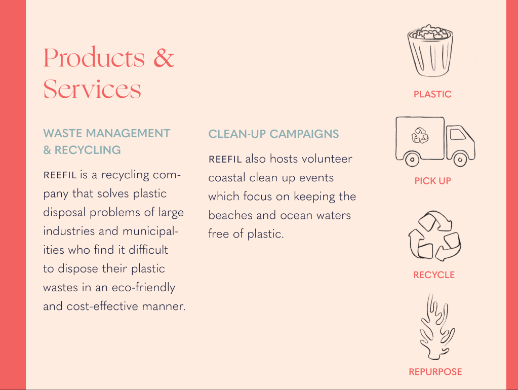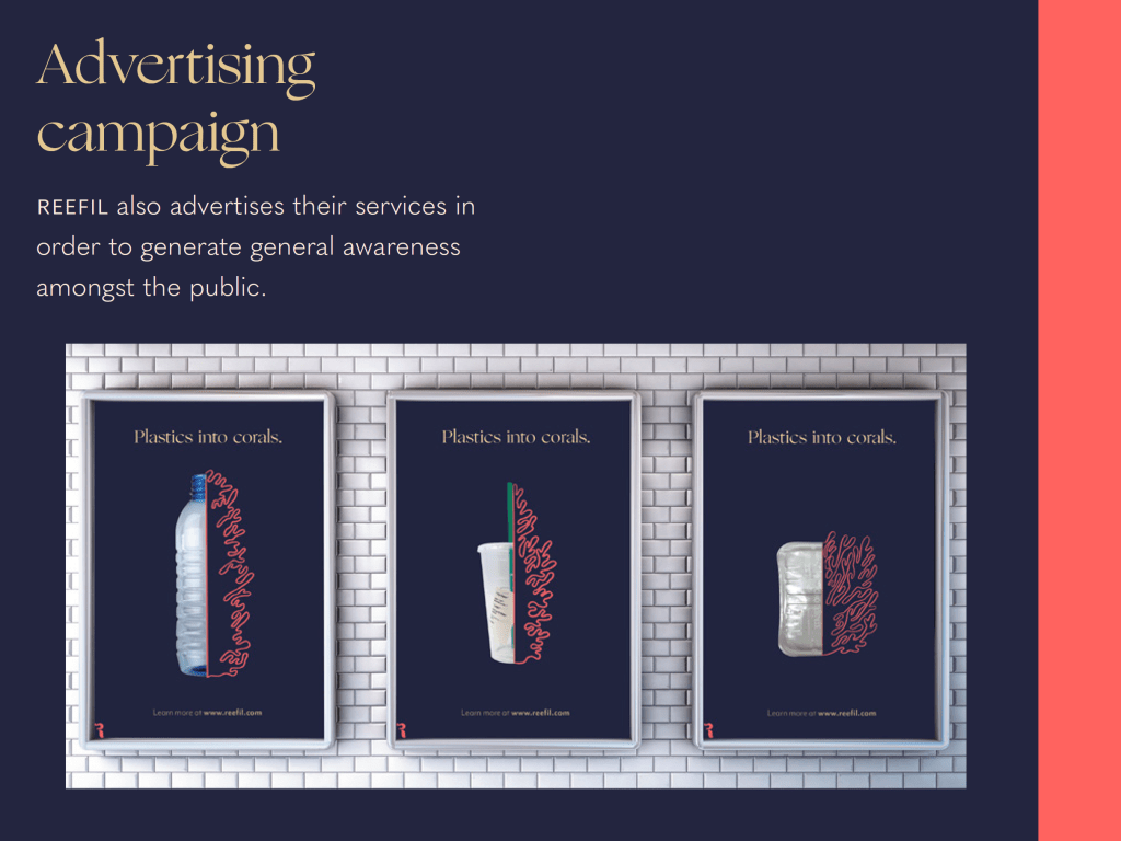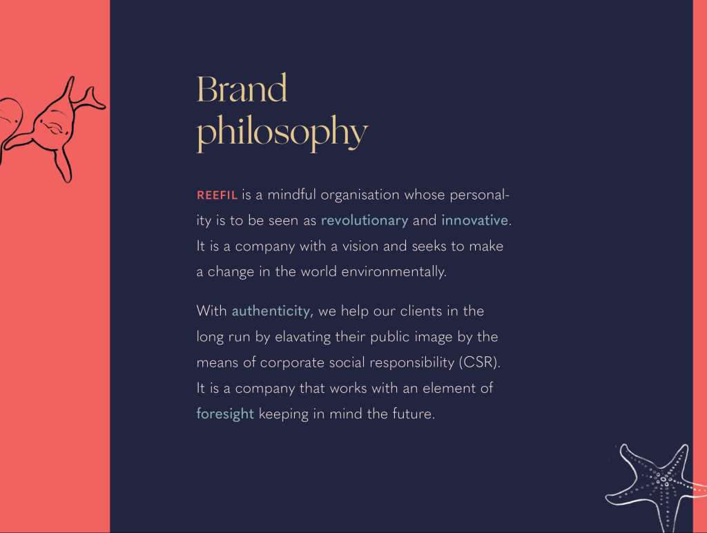 Reefil is an imaginary company that transforms plastic waste into ocean-friendly coral reef ecosystems. With a focus on innovation and authenticity, Reefil is a truly altruistic company that aims to make the world a better place.
