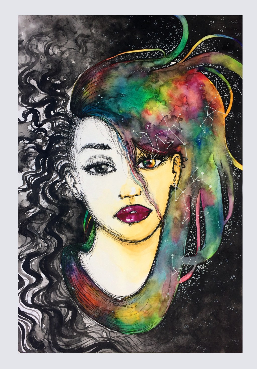 Media: Watercolors, White Gel Pen, White Acrylic paint, Black